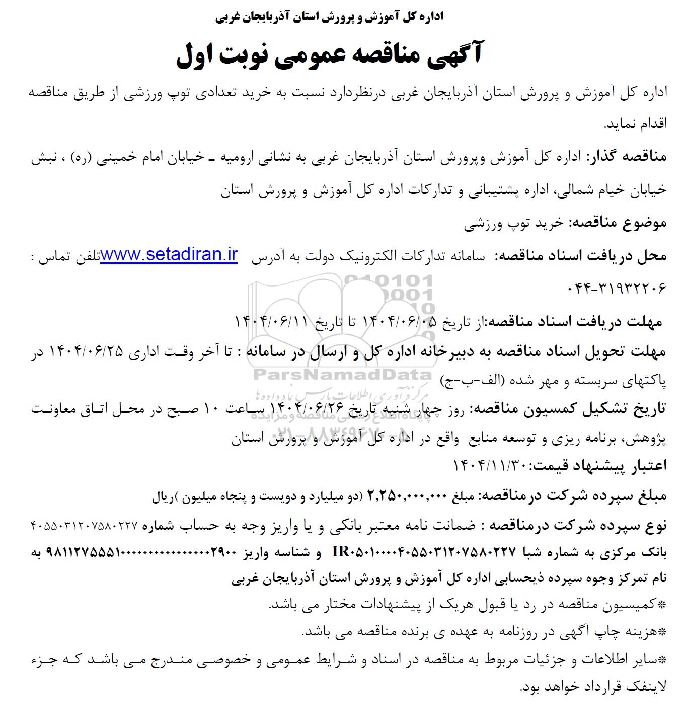 اداره کل آموزش و پرورش استان آذربایجان غربی در نظر دارد نسبت به خرید تعدادی توپ ورزشی از طریق مناقصه اقدام نماید.