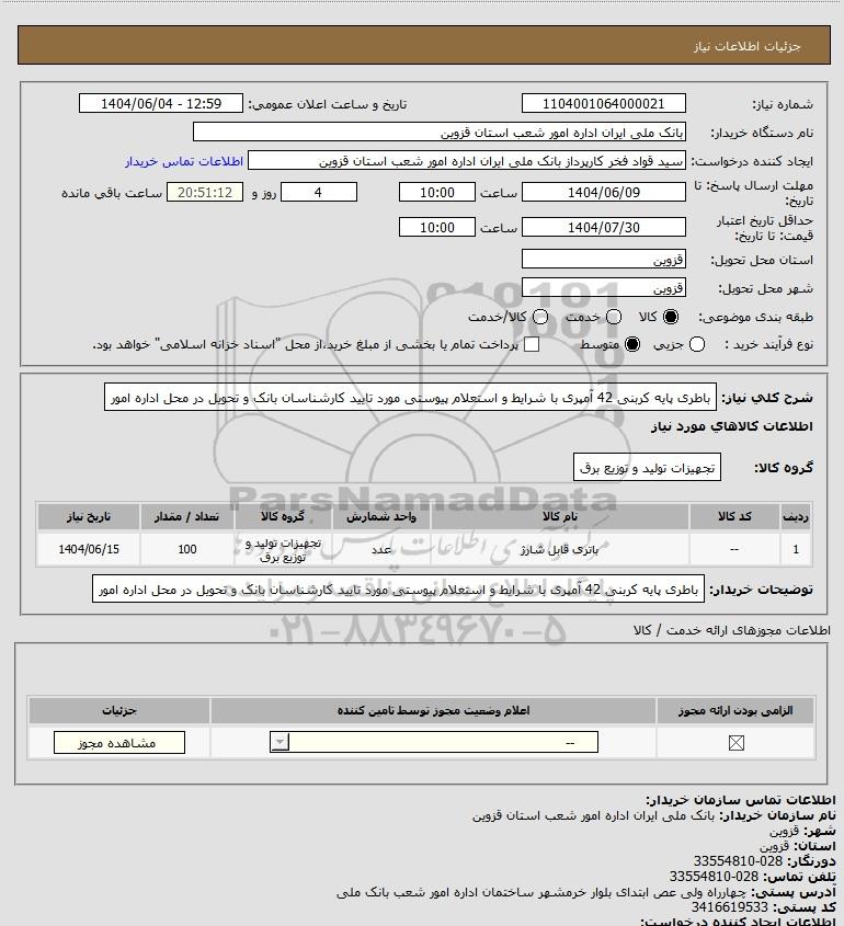 شرح کلی نیاز: باطری پایه کربنی 42 آمپری با شرایط و استعلام پیوستی مورد تایید کارشناسان بانک و تحویل در محل اداره امور