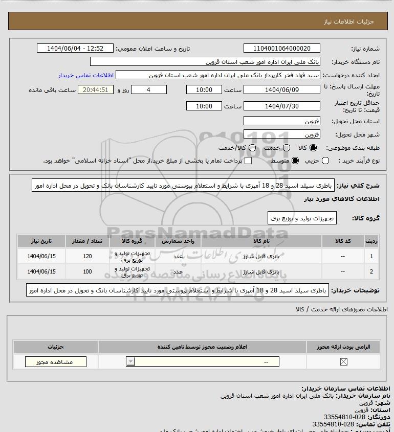 شرح کلی نیاز: باطری سیلد اسید 28 و 18 آمپری با شرایط و استعلام پیوستی مورد تایید کارشناسان بانک و تحویل در محل اداره امور
