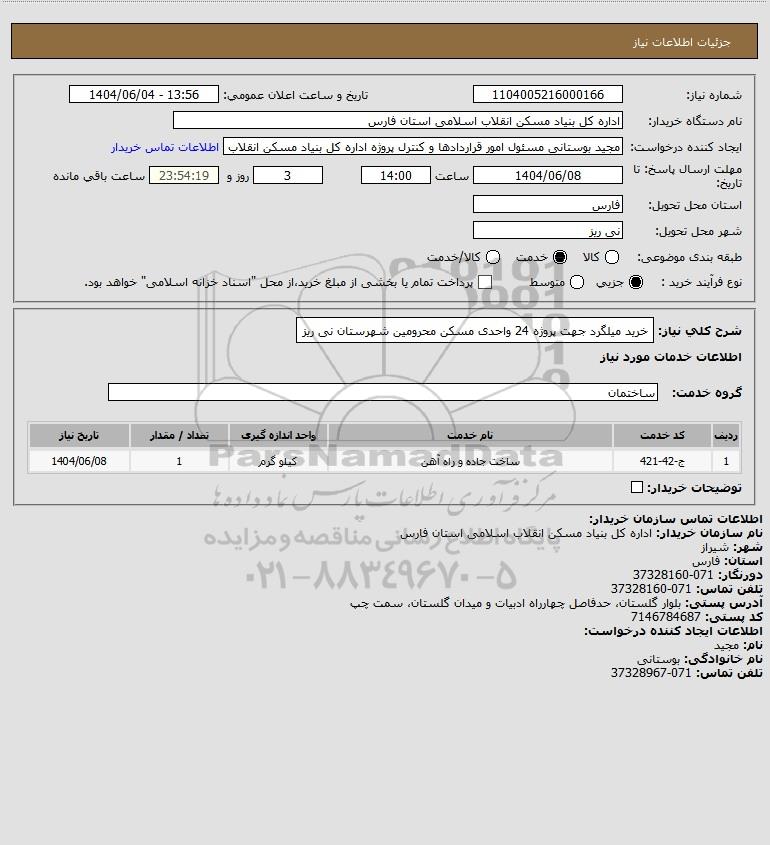 استعلام خرید میلگرد جهت پروژه 24 واحدی مسکن محرومین شهرستان نی ریز, استعلام خرید میلگرد جهت پروژه 24 واحدی مسکن محرومین شهرستان نی ریز