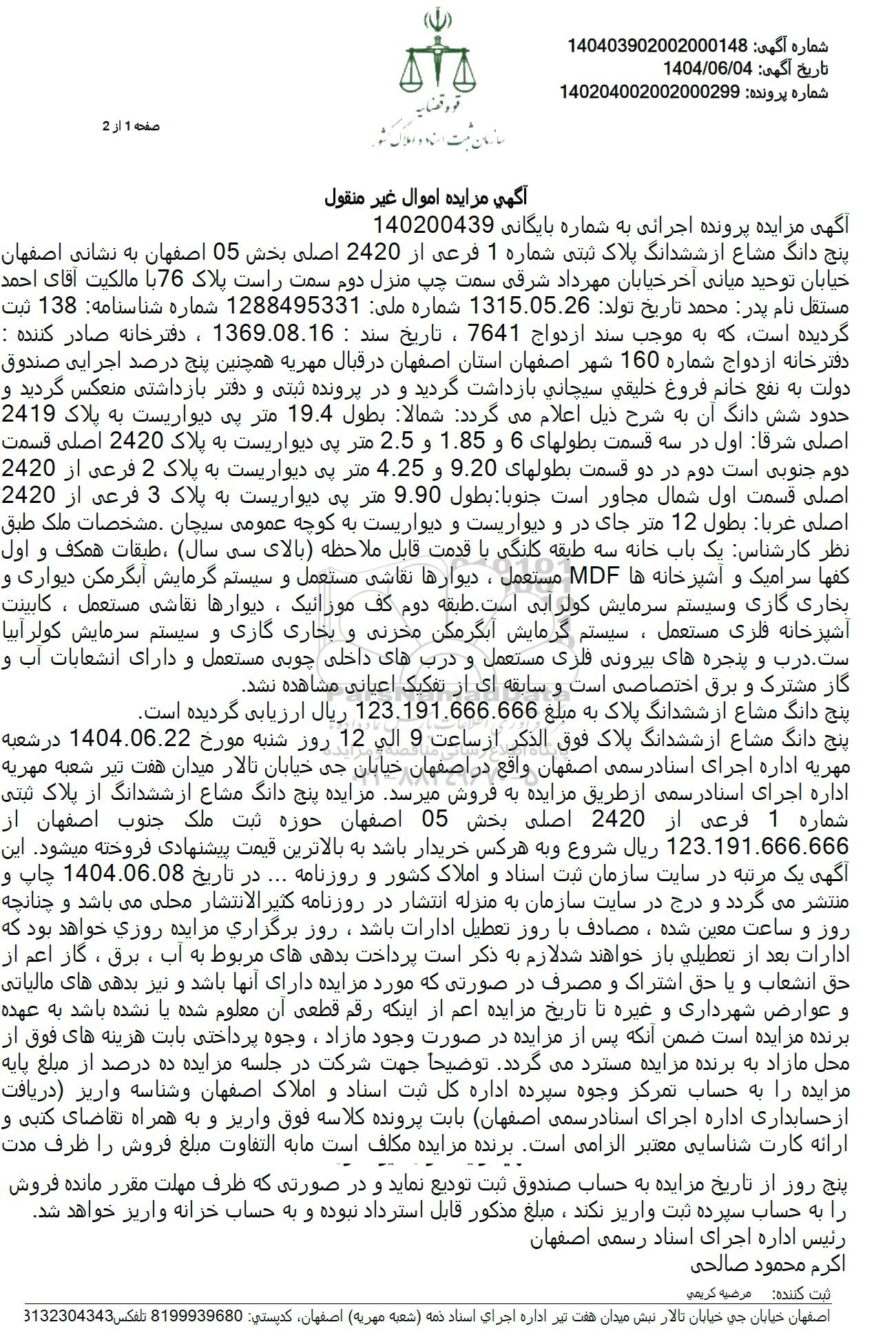 مزایده فروش ملک با پلاک ثبتی 1 فرعی از 2420 اصلی, مزایده فروش ملک با پلاک ثبتی 1 فرعی از 2420 اصلی