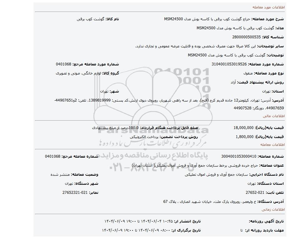 عنوان معامله: حراج خرده فروشی برخط سازمان جمع آوری و فروش اموال تملیکی( استان تهران)
