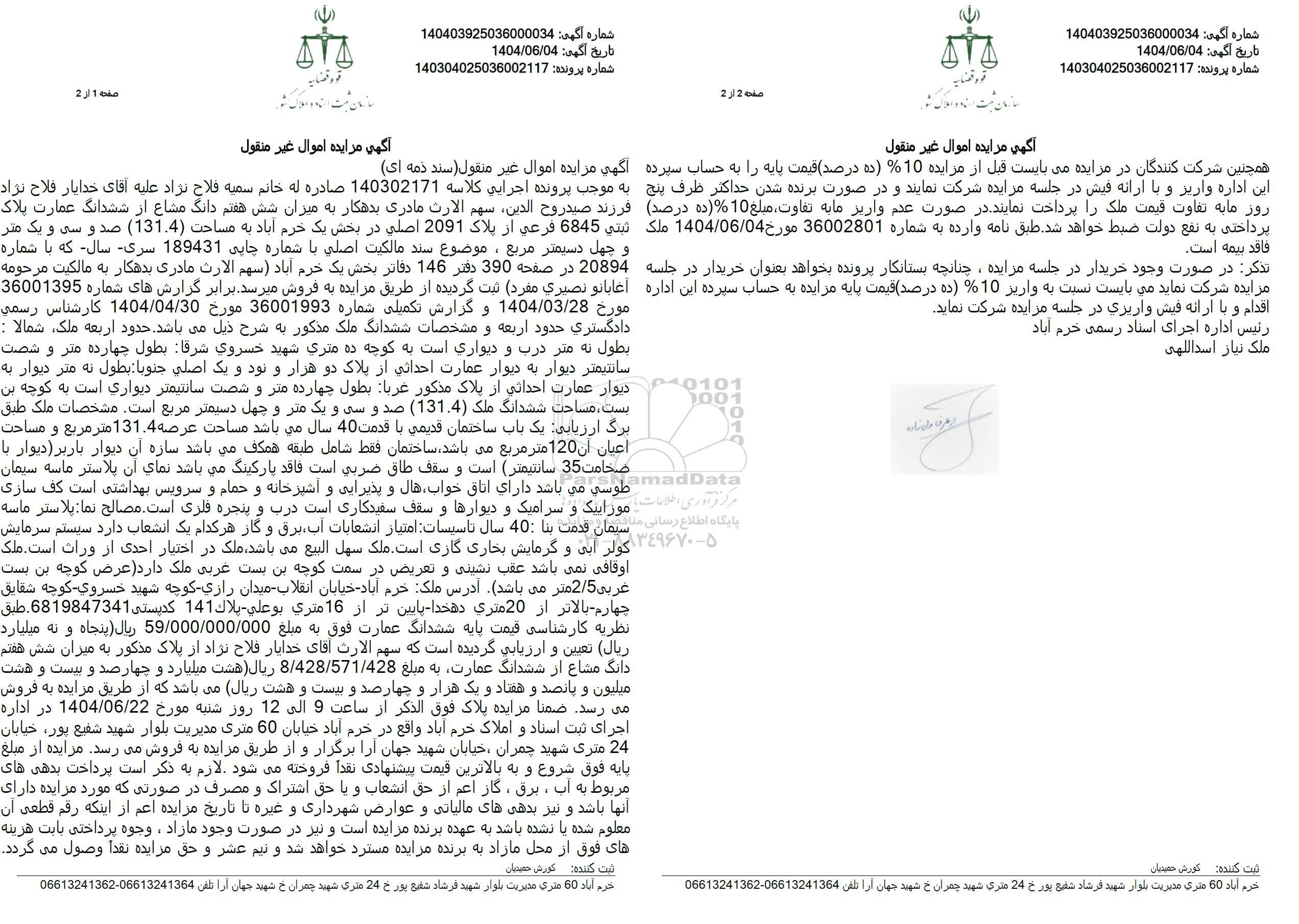 مزایده فروش میزان شش هفتم دانگ مشاع از ششدانگ عمارت پلاک ثبتی 6845 فرعی از پلاک 2091 اصلی در بخش یک خرم آباد به مساحت (131.4) صد و سی و یک متر و چهل دسیمتر مربع