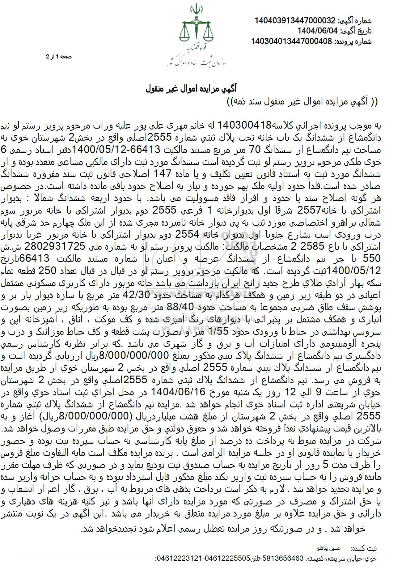 شماره آگهی: 140403913447000032