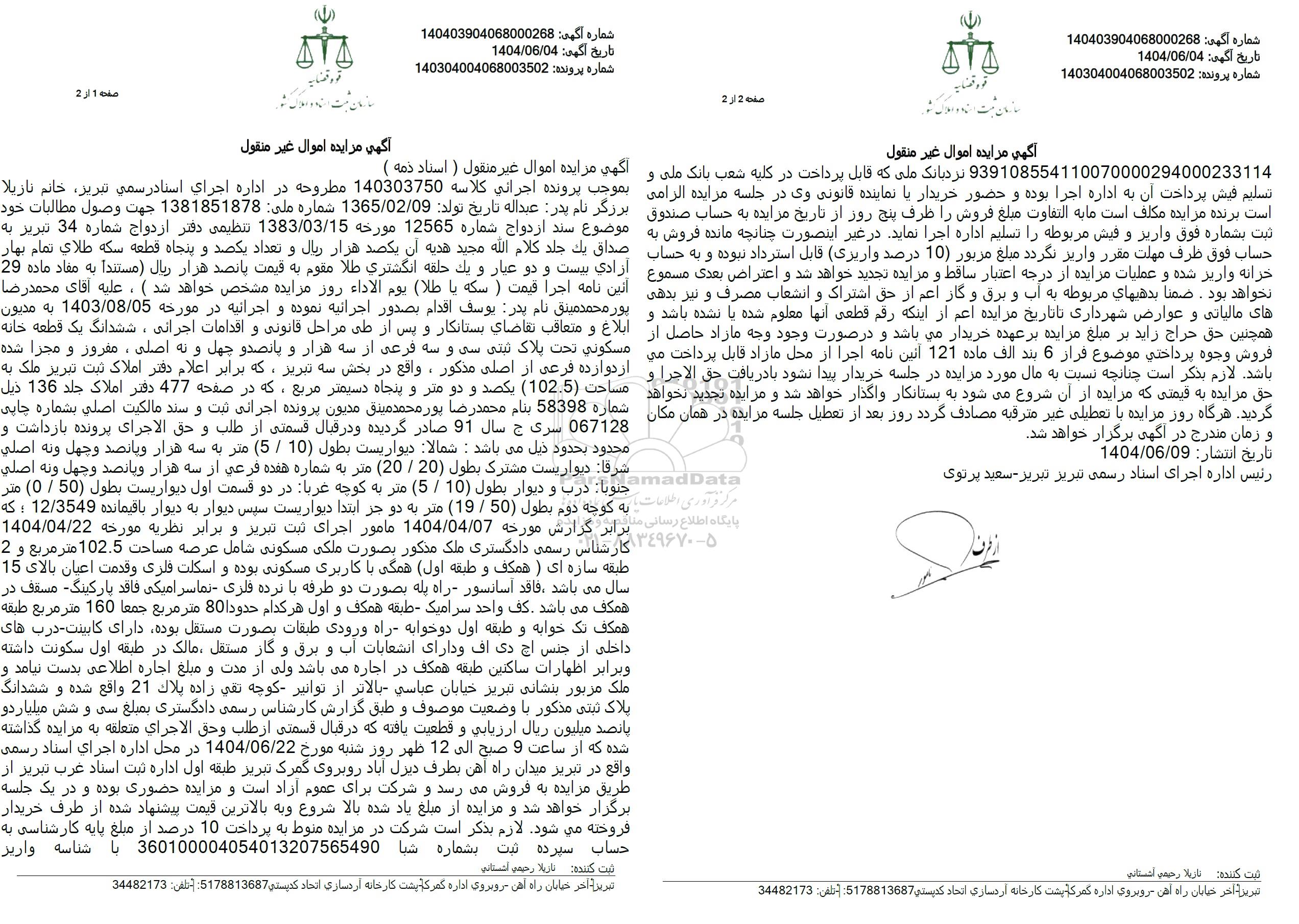 مزایده فروش ششدانگ یک قطعه خانه مسکونی تحت پلاک ثبتی سی و سه فرعی از سه هزار و پانصد و چهل و نه اصلی مفروز و مجزا شده از دوزاده فرعی از اصلی مذکور، واقع در بخش سه تبریز، مساحت 102.5 مربع