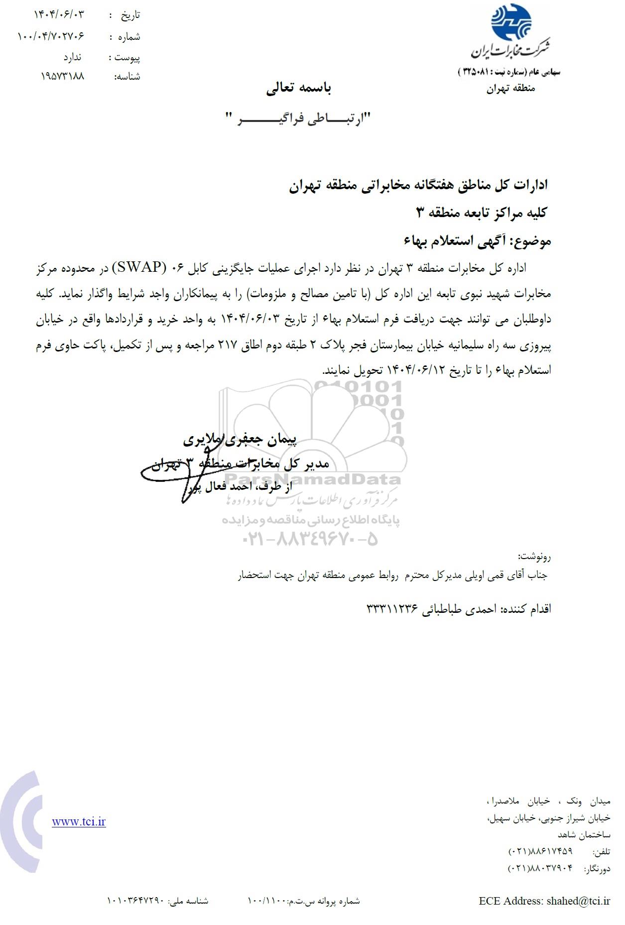 اداره کل مخابرات منطقه 3 تهران در نظر دارد اجرای عملیات جایگزینی کابل 06 (SWAP) در محدوده مرکز مخابرات شهید نبوی تابعه این اداره کل (با تامین مصالح و ملزومات) را به پیمانکاران واجد شرایط واگذار نماید. کلیه داوطلبان می توانند جهت دریافت فرم استعلام بهاء از تاریخ 1404.06.03 به واحد خرید و قراردادها واقع در خیابان پیروزی سه راه سلیمانیه خیابان بیمارستان فجر پلاک 2 طبقه دوم اطاق 217 مراجعه و پس از تکمیل پاکت حاوی فرم استعلام بهاء را تا تاریخ 1404.06.12 تحویل نمایند.