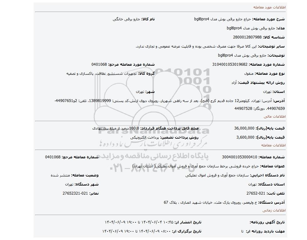 | نام دستگاه اجرایی: سازمان جمع آوری و فروش اموال تملیکی | وضعیت معامله: منتشر شده | |