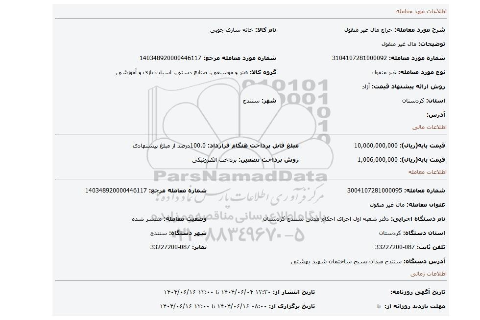 شرح مورد معامله: حراج مال غیر منقول نام کالا: خانه سازی چوبی
