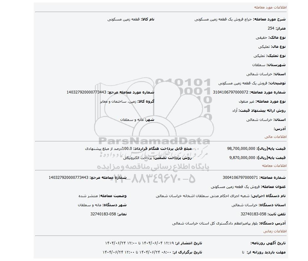 شرح مورد معامله: حراج فروش یک قطعه زمین مسکونی | نام کالا: قطعه زمین مسکونی | |