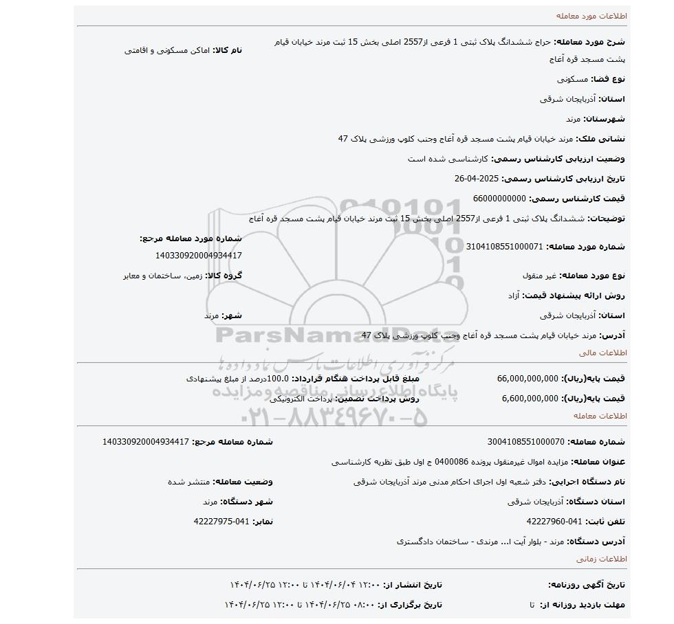 شرح مورد معامله: حراج ششدانگ پلاک ثبتی 1 فرعی از2557 اصلی بخش 15 ثبت مرند خیابان قیام پشت مسجد قره آغاج نام کالا: اماکن مسکونی و اقامتی
