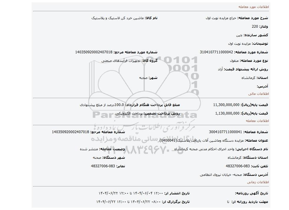 شرح مورد معامله: حراج مزایده نوبت اول | نام کالا: ماشین خرد کن لاستیک و پلاستیک | |