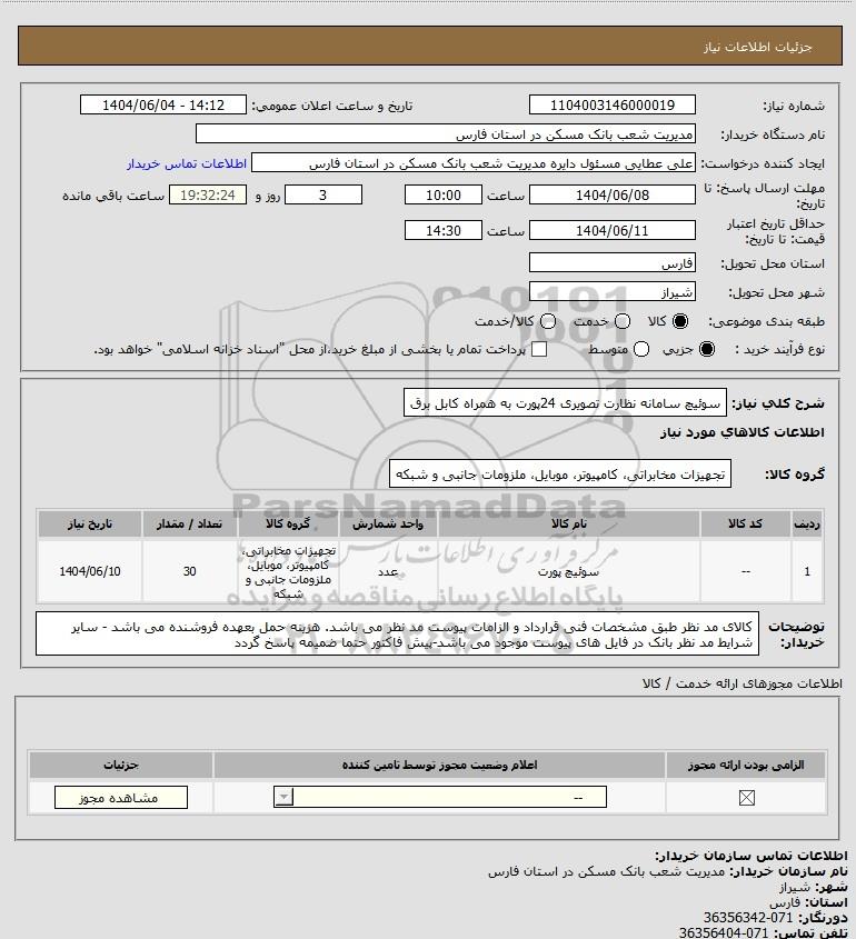 استعلام سوئیچ سامانه نظارت تصویری 24پورت به همراه کابل برق, استعلام سوئیچ سامانه نظارت تصویری 24پورت به همراه کابل برق