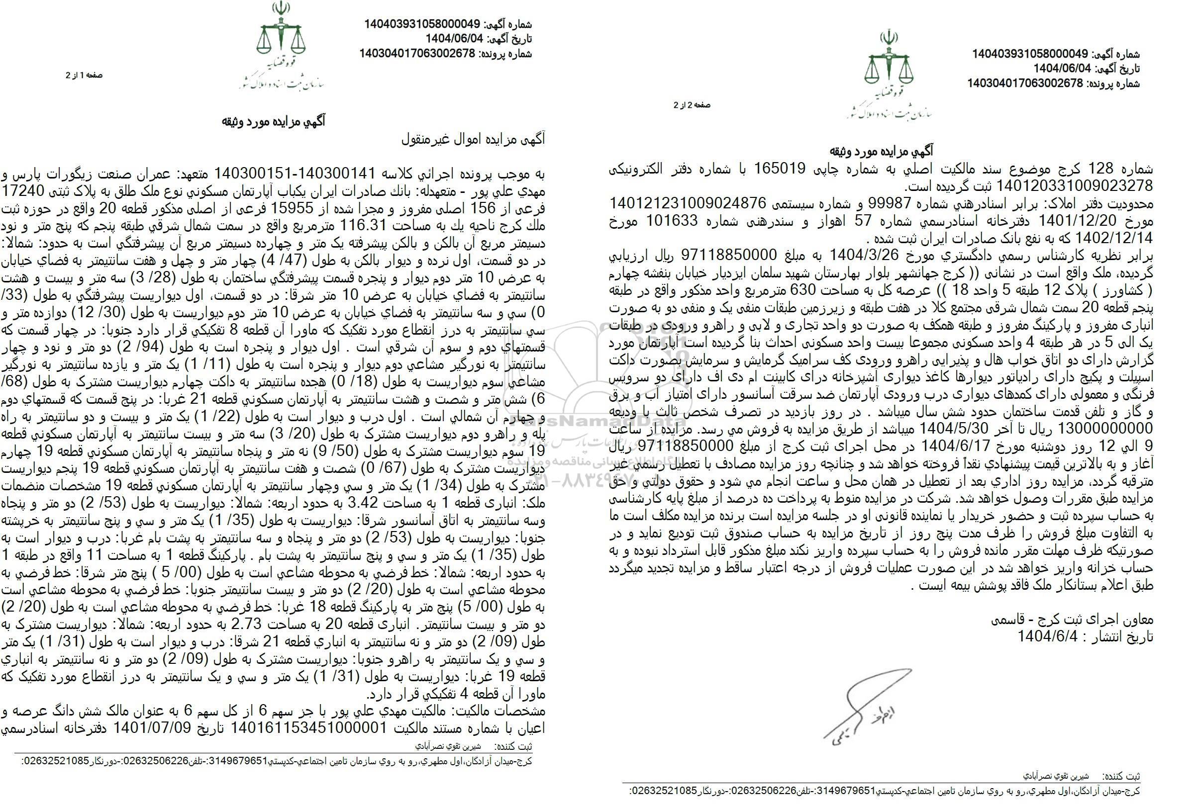 مزایده فروش یکباب آپارتمان مسکونی به پلاک ثبتی 17240 فرعی از 156 اصلی , مزایده فروش یکباب آپارتمان مسکونی به پلاک ثبتی 17240 فرعی از 156 اصلی