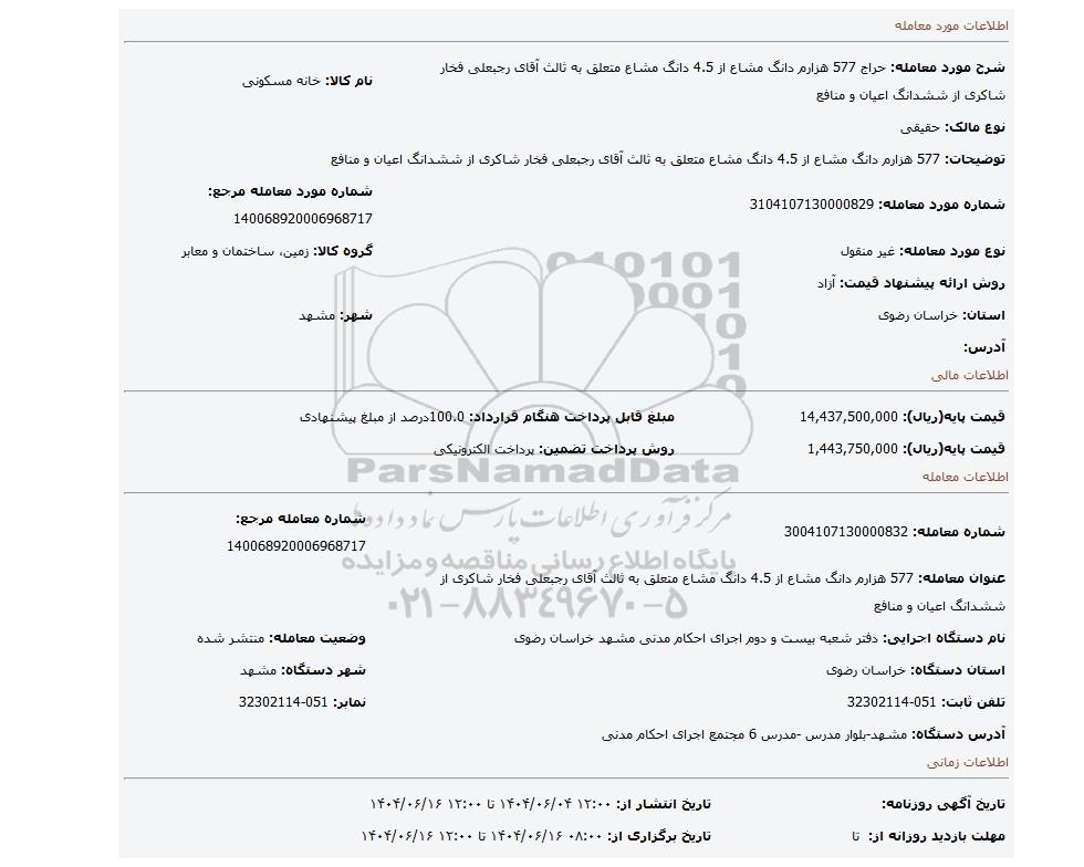 عنوان معامله: 577 هزارم دانگ مشاع از 4.5 دانگ مشاع متعلق به ثالث آقای رجبعلی فخار شاکری از ششدانگ اعیان و منافع