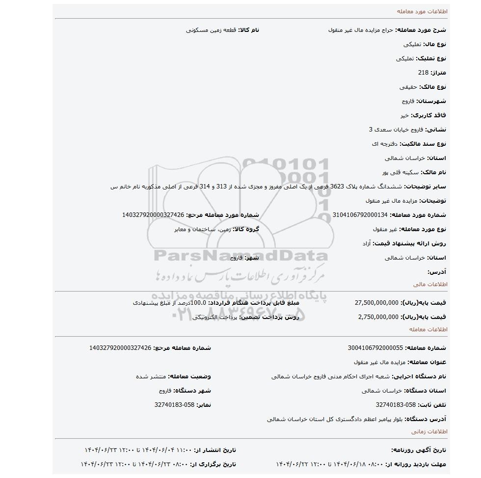 نام دستگاه اجرایی: شعبه اجرای احکام مدنی فاروج خراسان شمالیوضعیت معامله: منتشر شده