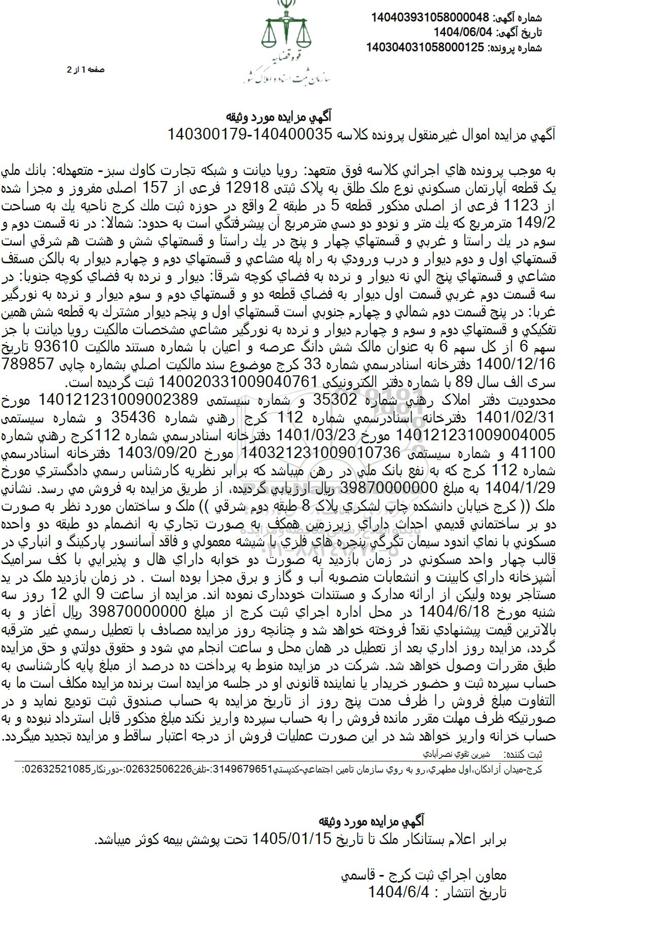 مزایده فروش یک قطعه آپارتمان مسکونی نوع ملک طلق به پلاک ثبتی 12918 فرعی از 157 اصلی