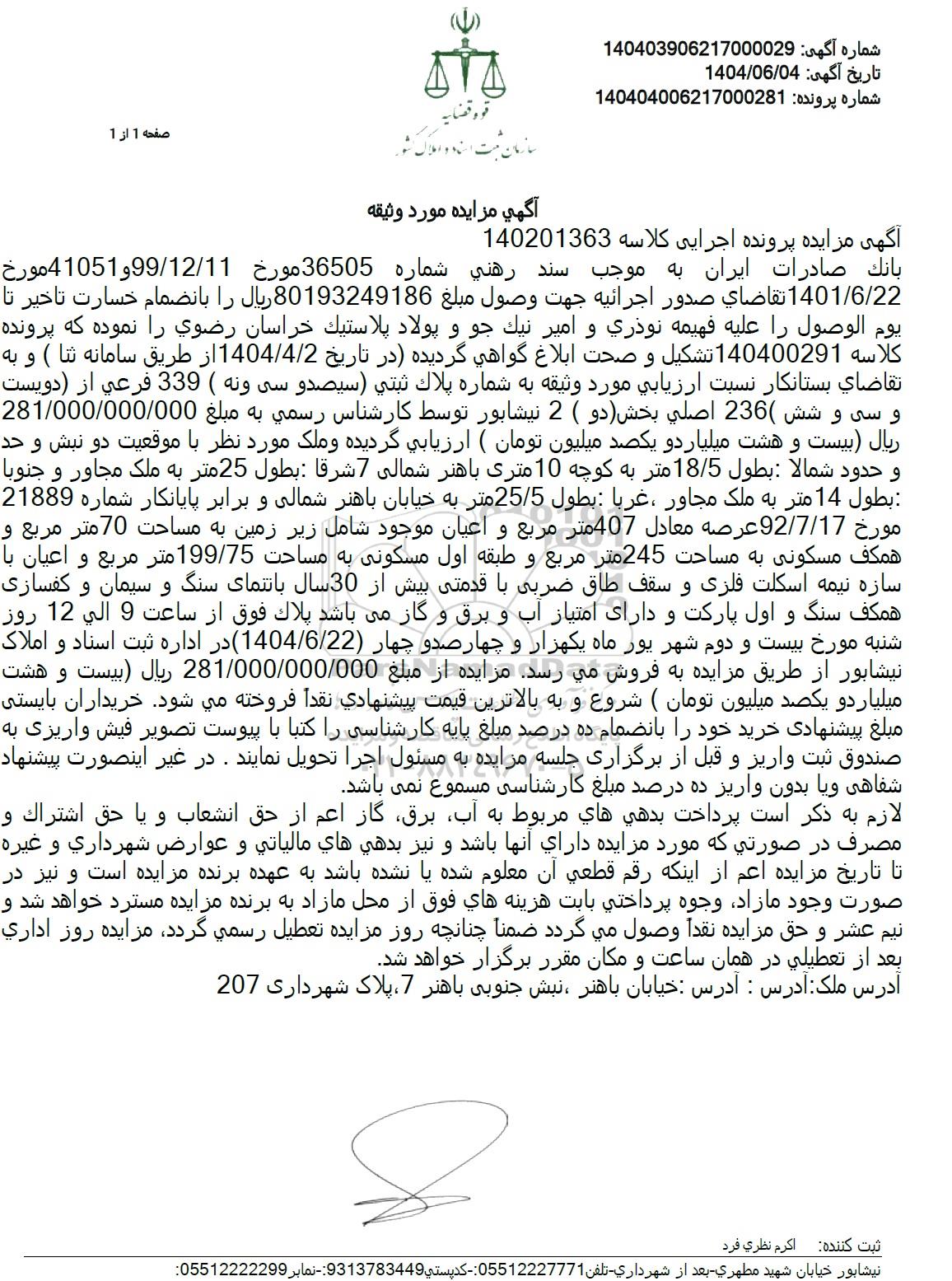مزایده فروش ملک به پلاک ثبتی 339 فرعی از 236 اصلی به مساحت عرصه 245 مترمربع