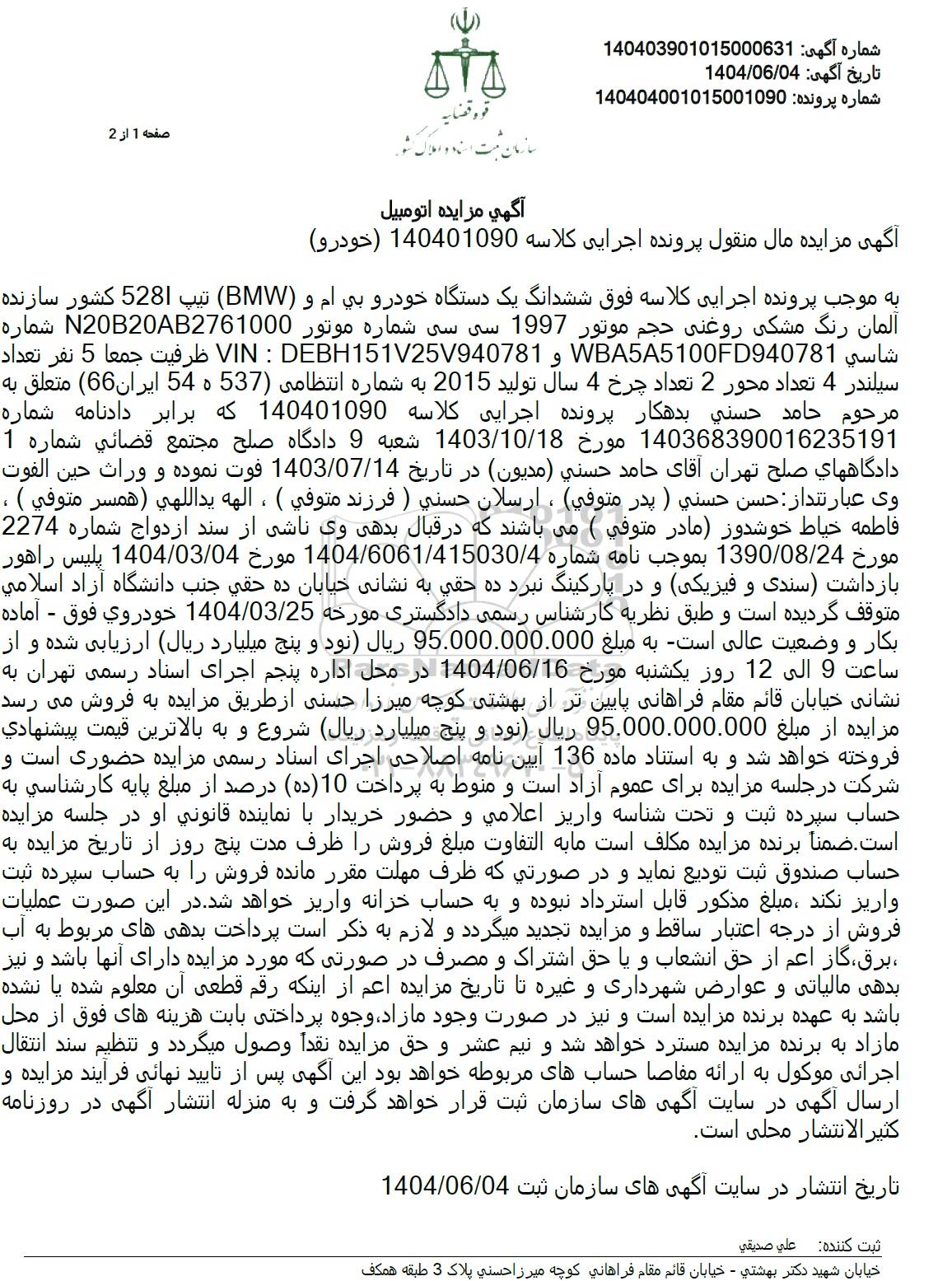 مزایده یک ششدانگ یک دستگاه خودرو بی ام و تیپ 5281