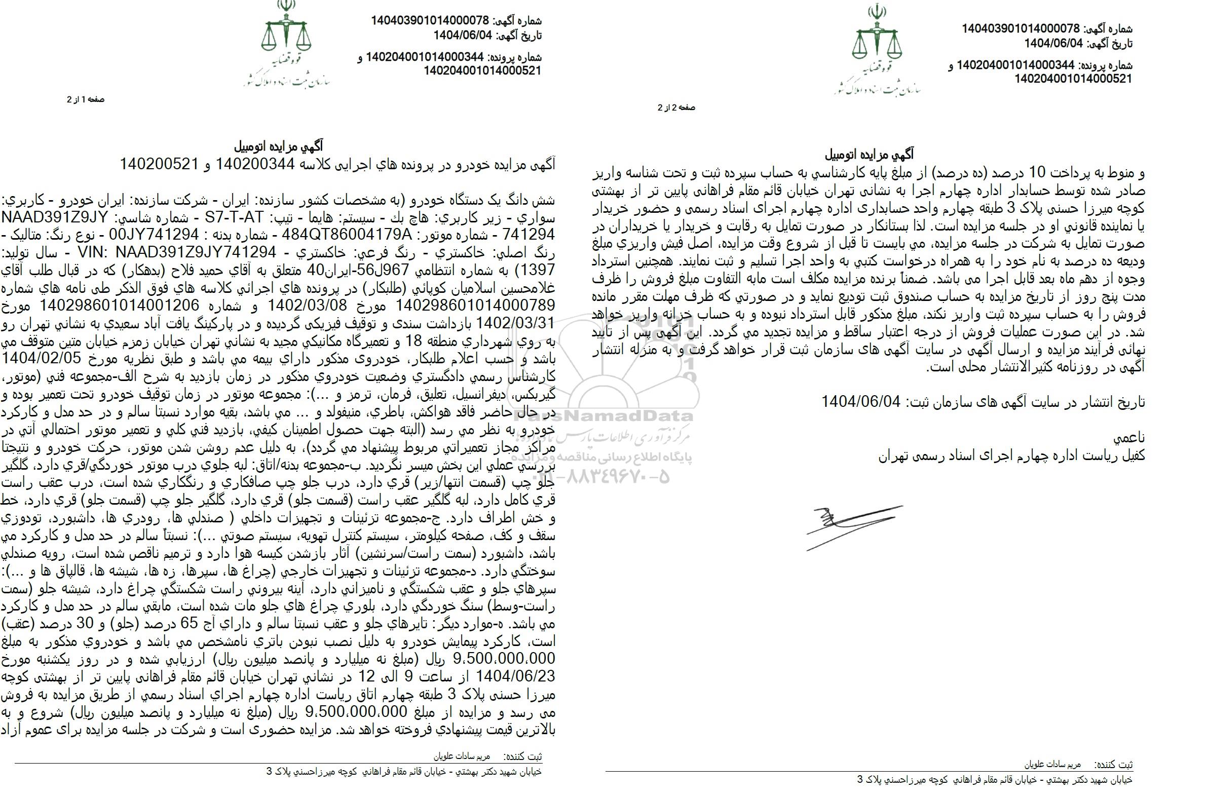 مزایده فروش ششدانگ یک دستگاه خودرو سواری - هاچ بک هایما تیپ ST-T-AT رنگ اصلی خاکستری سال تولید 1397