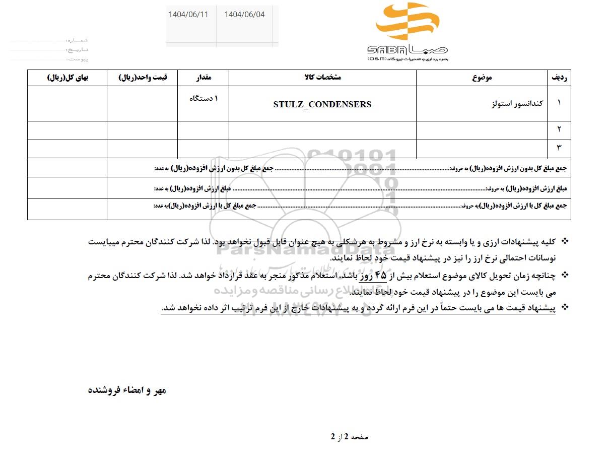 استعلام بها و موضوع استعلام استعلام کندانسور استولز به اطلاع کلیه شرکت‌ها و افراد متخصص واجد شرایط می‌رساند، آگهی گذار در نظر دارد از طریق استعلام بها، نسبت به انتخاب و دریافت پیشنهادات اقدام نماید. این استعلام با کد آگهی ثبت شده در سامانه خبرگزاری پارس نماد : 9459501 منتشر شده است. مشخصات استعلام : تاریخ شروع استعلام: 1404/06/04 آخرین مهلت ارسال پیشنهاد قیمت : 1404/06/11 و محل اجرای پروژه : استان سایر میباشد. استعلام قیمت مورد درخواست : استعلام کندانسور استولز با دسته‌بندی‌های تخصصی و گروه های مرتبط : صنایع حرارتی و برودتی, نیروگاه, برج های تقطیر،مخازن تحت فشار و مبدل های حرارتی, تجهیزات برق و الکترونیک, استعلام اطلاع رسانی میگردد. شرایط شرکت در استعلام آنلاین : ابتدا ثبت نام در سامانه استعلام پارس نماد و تکمیل مدارک موردنیاز و بارگذاری در سامانه رعایت تمامی ضوابط و الزامات مندرج در اسناد استعلام است.