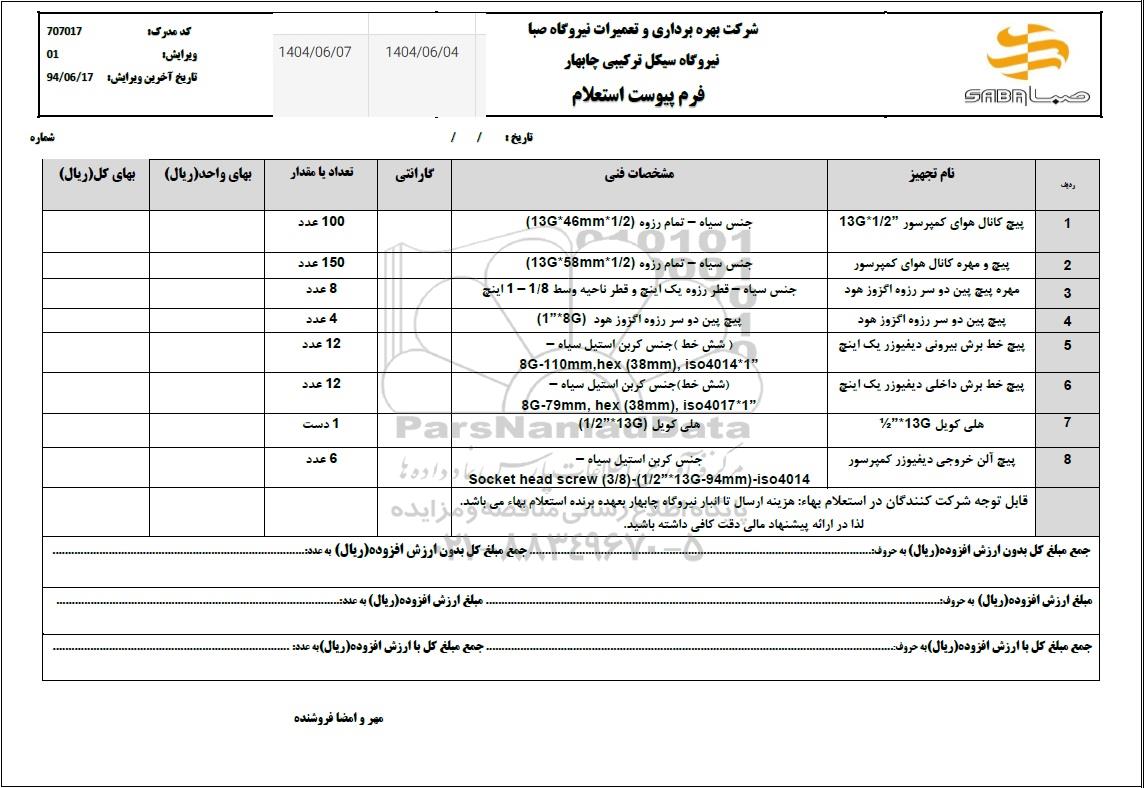 استعلام بها و موضوع استعلام استعلام پیچ کانال هوای کمپرسور 13G*1.2" به اطلاع کلیه شرکتها و افراد متخصص واجد شرایط میرساند، آگهی گذار در نظر دارد از طریق استعلام بها، نسبت به انتخاب و دریافت پیشنهادات اقدام نماید. این استعلام با کد آگهی ثبت شده در سامانه خبرگزاری پارس نماد : 9459570 منتشر شده است. مشخصات استعلام : تاریخ شروع استعلام: 1404/06/04 آخرین مهلت ارسال پیشنهاد قیمت : 1404/06/07 و محل اجرای پروژه : استان سیستان و بلوچستان میباشد. استعلام قیمت مورد درخواست : استعلام پیچ کانال هوای کمپرسور 13G*1.2" با دستهبندیهای تخصصی و گروه های مرتبط : انواع فنر, پیچ و مهره, دریچه و کانال هوا, کمپرسورهای هوا, نیروگاه, تجهیزات برق و الکترونیک, استعلام اطلاع رسانی میگردد. شرایط شرکت در استعلام آنلاین : ابتدا ثبت نام در سامانه استعلام پارس نماد و تکمیل مدارک موردنیاز و بارگذاری در سامانه رعایت تمامی ضوابط و الزامات مندرج در اسناد استعلام است.