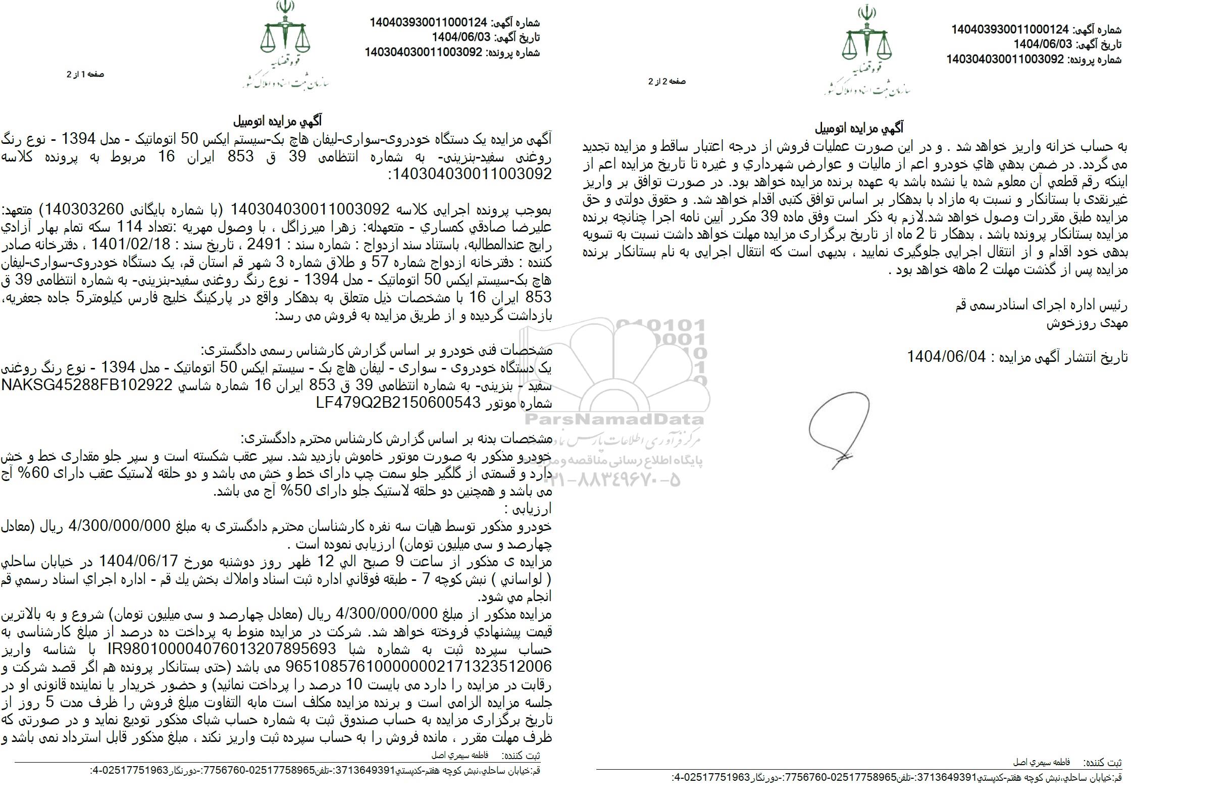 1 مزایده فروش خودروی سواری پژو تیپ پارس 9686528 1404/07/20 new not special not payed آذربایجان شرقی