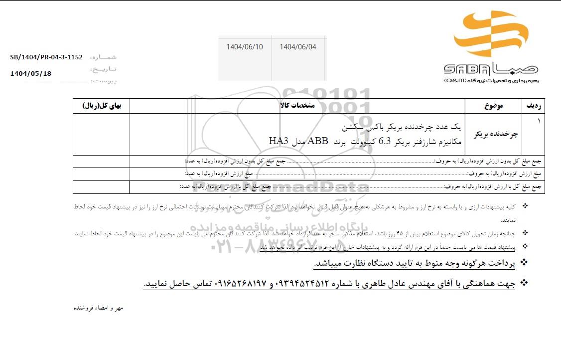 استعلام بها و موضوع استعلام استعلام چرخدنده بریکر به اطلاع کلیه شرکت‌ها و افراد متخصص واجد شرایط می‌رساند، آگهی گذار در نظر دارد از طریق استعلام بها، نسبت به انتخاب و دریافت پیشنهادات اقدام نماید. این استعلام با کد آگهی ثبت شده در سامانه خبرگزاری پارس نماد : 9459658 منتشر شده است. مشخصات استعلام : تاریخ شروع استعلام: 1404/06/04 آخرین مهلت ارسال پیشنهاد قیمت : 1404/06/10 و محل اجرای پروژه : استان سایر میباشد. استعلام قیمت مورد درخواست : استعلام چرخدنده بریکر با دسته‌بندی‌های تخصصی و گروه های مرتبط : انواع کلید و پریزهای برقی و صنعتی, ماشین کاری, نیروگاه, تجهیزات برق و الکترونیک, استعلام اطلاع رسانی میگردد. شرایط شرکت در استعلام آنلاین : ابتدا ثبت نام در سامانه استعلام پارس نماد و تکمیل مدارک موردنیاز و بارگذاری در سامانه رعایت تمامی ضوابط و الزامات مندرج در اسناد استعلام است.