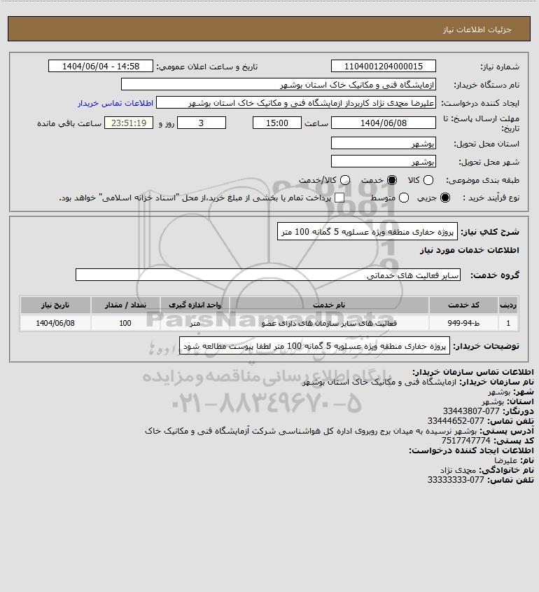 شرح کلی نیاز: پروژه حفاری منطقه ویژه عسلویه 5 گمانه 100 متر