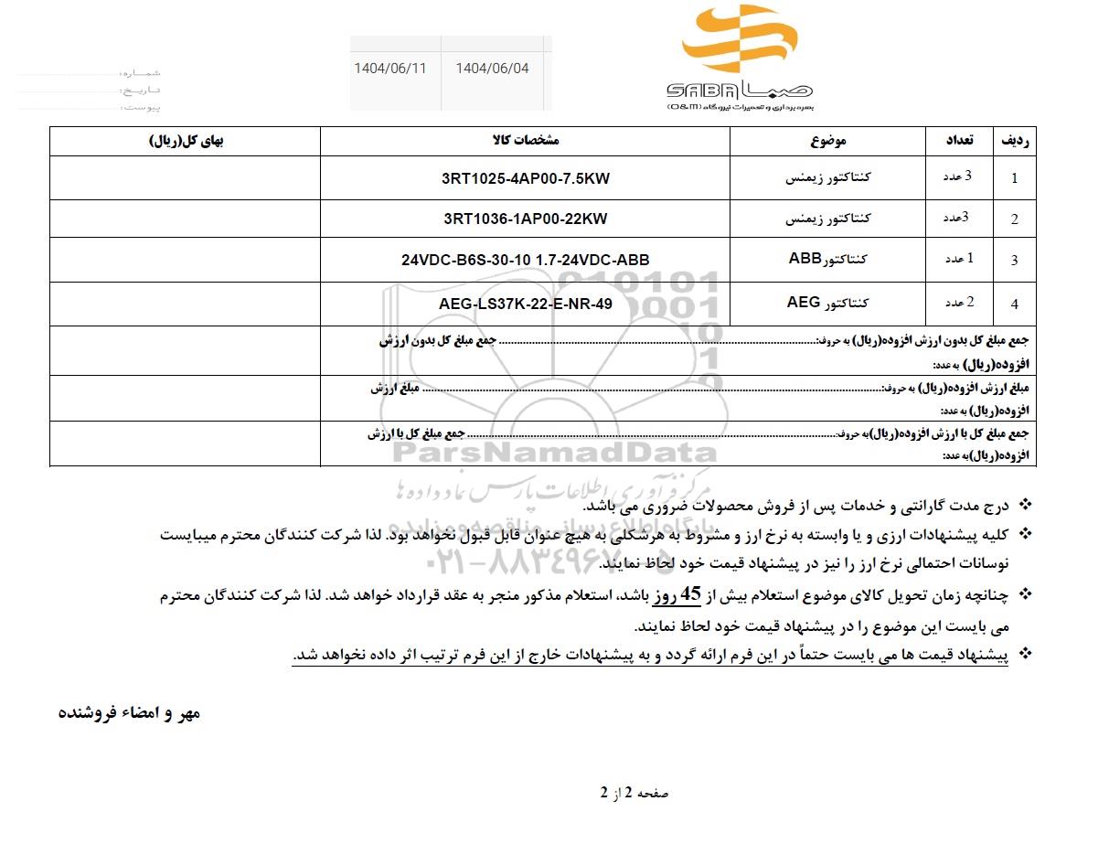 استعلام بها و موضوع استعلام استعلام کنتاکتور زیمنس ... به اطلاع کلیه شرکتها و افراد متخصص واجد شرایط میرساند، آگهی گذار در نظر دارد از طریق استعلام بها، نسبت به انتخاب و دریافت پیشنهادات اقدام نماید. این استعلام با کد آگهی ثبت شده در سامانه خبرگزاری پارس نماد : 9459669 منتشر شده است. مشخصات استعلام : تاریخ شروع استعلام: 1404/06/04 آخرین مهلت ارسال پیشنهاد قیمت : 1404/06/11 و محل اجرای پروژه : استان سایر میباشد. استعلام قیمت مورد درخواست : استعلام کنتاکتور زیمنس ... با دستهبندیهای تخصصی و گروه های مرتبط : انواع کلید و پریزهای برقی و صنعتی, نیروگاه, تجهیزات برق و الکترونیک, استعلام اطلاع رسانی میگردد. شرایط شرکت در استعلام آنلاین : ابتدا ثبت نام در سامانه استعلام پارس نماد و تکمیل مدارک موردنیاز و بارگذاری در سامانه رعایت تمامی ضوابط و الزامات مندرج در اسناد استعلام است.