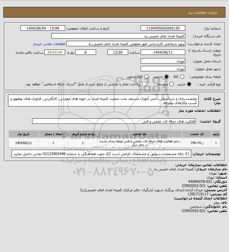 شرح کلی نیاز: توانمندسازی و شناسایی دانش آموزان مستعد تحت حمایت کمیته امداد در حوزه های مهارتی، کارآفرینی، فناوری های نوظهور و کسب وکارهای نوآورانه