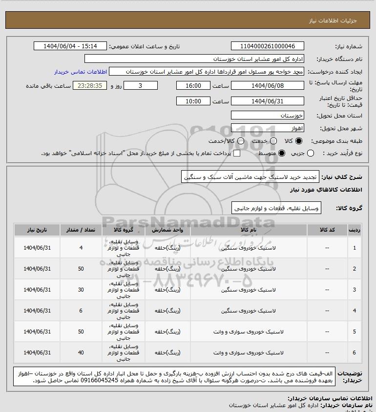 | 5 | -- | لاستیک خودروی سواری و وانت | (رینگ)حلقه | وسایل نقلیه، قطعات و لوازم جانبی | 50 | 1404/06/31 |