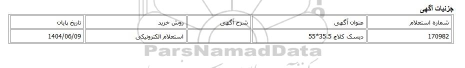 | 170982 | دیسک کلاچ 35.5*55 | استعلام الکترونیکی | 1404/06/09 |