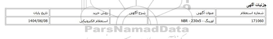 | 171060 | اورینگ - NBR - 230x5 | استعلام الکترونیکی | 1404/06/08 |
