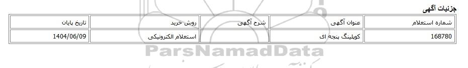 | 168780 | کوپلینگ پنجه ای | استعلام الکترونیکی | 1404/06/09 |