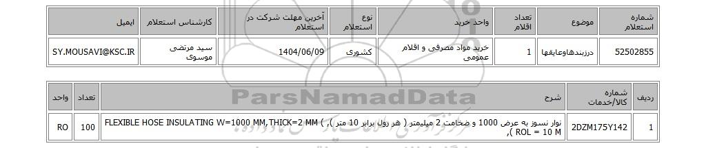 52502855درزبندهاوعایقها1خرید مواد مصرفی و اقلام عمومیکشوری1404/06/09سید مرتضی موسویSY.MOUSAVI@KSC.IR