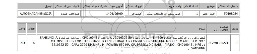 | 52498934 | فیلتر روغن | 1 | خرید تجهیزات وقطعات یدکی | کشوری | 1404/06/09 | عبدالامیر مقدم | A.MOGHADAM@KSC.IR |