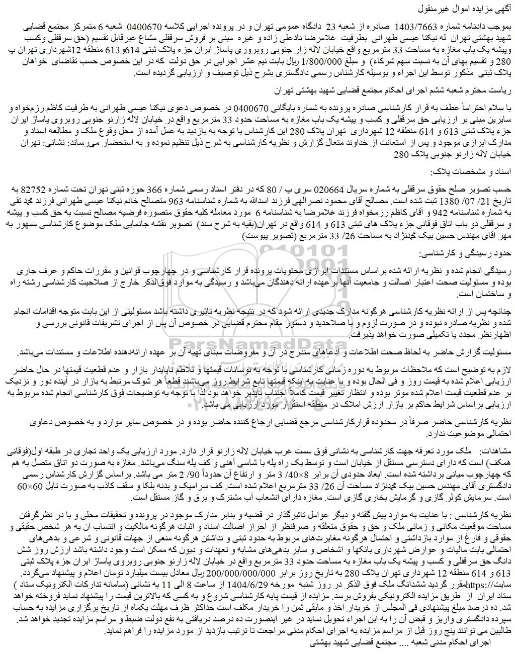 بموجب دادنامه شماره 1403/7663 صادره از شعبه 23 دادگاه عمومی تهران و در پرونده اجرایی کلاسه 0400670 شعبه 6 متمرکز مجتمع قضایی شهید بهشتی تهران له نیکتا عیسی طهرانی بطرفیت غلامرضا نادعلی زاده و غیره مبنی بر فروش سرقفلی مشاع غیرقابل تقسیم (حق سرقفلی وکسب وپیشه یک باب مغازه به مساحت 33 مترمربع واقع خیابان لاله زار جنوبی روبروری پاساژ ایران جزء پلاک ثبتی 614و613 منطقه 12شهرداری تهران پ 280 و تقسیم بهای آن به نسبت سهم شرکاء) و مبلغ 1/800/000 ریال بابت نیم عشر اجرایی در حق دولت که در این خصوص حسب تقاضای خواهان پلاک ثبتی مذکور توسط این اجراء و بوسیله کارشناس رسمی دادگستری بشرح ذیل توصیف و ارزیابی گردیده است.
