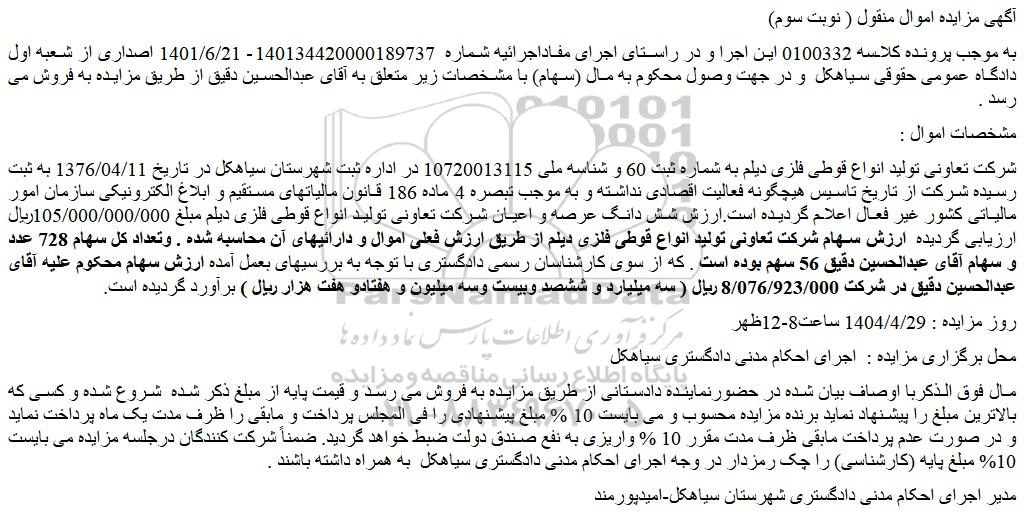 به موجب پرونده کلاسه 0100332 این اجرا و در راستای اجرای مفاداجرائیه شماره 140134420000189737- 1401/6/21 اصداری از شعبه اول دادگاه عمومی حقوقی سیاهکل و در جهت وصول محکوم به مال (سهام) با مشخصات زیر متعلق به آقای عبدالحسین دقیق از طریق مزایده به فروش می رسد .