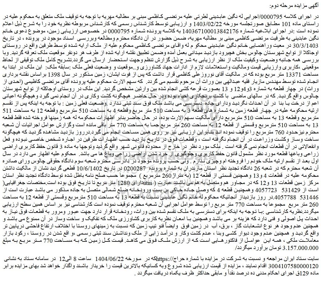 در اجرای کلاسه 0000795/اجرایی له نگین عابدینی لطرتی علیه مرتضی کاظمی مبنی بر مطالبه مهریه با توجه به توقیف ملک متعلق به محکوم علیه در راستای ماده 101 مطابق صورتجلسه مورخه 1403/02/22 و ارزیابی توسط کارشناس رسمی که کارشناس مربوطه نظریه خود را به شرح ذیل اعلام نموده است :در اجرای ابلاغیه شماره 140367100013842176 به کلاسه پرونده شماره 0000795 در خصوص ارزیابی زمین، موضوع دعوی خانم نگین عابدینی به طرفیت مرتضی کاظمی مبنی بر مطالبه مهریه، ضمن حضور در آن دادگاه محترم ومطالعه وبررسی اسناد موجود در پرونده ، در تاریخ 30/3/1403 در معیت وراهنمایی خانم نگین عابدینی محکو م له واقای مرتضی کاظمی محکوم علیه از ملک ارایه شده توسط طرفین واقع در روستای اوجاکلا از توابع شهرستان چالوس بخش هچیرود بازدید میدانی بعمل آمده وضمن تطبیق نقشه ارایه شده از طرف هر دونفر موقعیت ملک تعرفه گردید. وبا بررسی همه جانبه وضعیت وکیفیت ملک از نظر ارزیابی به شرح ذیل گزارش تنظم وجهت استحضار ارسال می گردد.تشریح کامل ملک توقیفی از لحاظ موقعیتی ،کاربری وارزیابی قیمت ومالکیت واستعلامات لازم از ادارات جهاد کشاورزی و..موقعیت و وضعیت فعلی ملک :سابقه ملک: این ملک در ابتدا به مساحت 13371 متر مربع بوده که در مالکیت آقای نوروزعلی کاظمی قرار داشت که پس از فوت ایشان، زمین مذکور در سال 1398 براساس نقشه برداری انجام شده توسط مهندس مازیار فقیه عبدالهی بین وراث آن مرحوم تقسیم می گردد. که سهم الارث محکوم علیه پرونده آقای مرتضی کاظیمی (احدی از وراث) در چهار قطعه به شماره 3و4و12 و 13 بصورت قرعه کشی انجام شده بین وارثین مشخص گردید. این ملک در روستای اوجاکله از توابع شهرستان چالوس واقع گردید. که در سالهای ماضی با کشت برنجکاری احیاء بوده ودر حال حاضر هیچگونه کشت وکاری در آن انجام نمی گیرد وهیچگونه اعیانی اعم از درخت یا بنا در آن احداث نگردید ودارای جاده دسترسی می باشد ملک فوق سند ثبتی ندارد .وضعیت فعلی زمین : با توجه به اینکه پس از تقسم ارثیه محکومه علیه در چهار قطعه زمین به شماره های قطعه 3 به مساحت 510 متر مربع وقطعه 4 به مساحت 510 مترمربع وقطعه 12 به مساحت 511 مترمربع وقطعه 13 به مساحت 510 مترمربع دارای مالکیت سهم الارث بوده، در حال حاضربنابر اظهارات محکومه له همه زمینها فروخته شده فقط قطعه 13 به مساحت 510 مترمربع وقسمتی از قطعه 12 به مساحت 260 متر مربع جما به مساحت 770 متر باقی مانده است وگزارش عوامل اجرائیات آن شعبه محترم نیزحدود 760 مترمربع را توقیف نموده اند بنابراین ارزیابی نیز بر روی همین مساحت انجام می گیرد.درروز بازدید مشاهده گردید که هیچگونه ساخت وساز وکشت وزراعت در آن انجام نگرفته است ، وقطعات فوق در تاریخ بازدید حسب اظهارات طرفین در اجاره شخص خاصی نبوده و فعل وانفعالاتی در آن قطعات انجام نمی گرفته است . ملک مورد نظر در خارج از محدوده قانونی شهر واقع گردید وتوجها به ماده 3 قانون حفظ کاربری اراضی زراعی وباغها قطعه مورد نظر مشمول قانون حفظ کاربری وجلوگیری از خرد شدن اراضی زراعی وباغ ها می باشد. محکوم علیه اظهار می دارد در سال اول بعد از تقسم ارثیه ملک خودم را فروخته ام وچیزی ندارم . ولی حسب پرونده موجود در دادرسی محترم شعبه سوم دادگاه حقوقی چالوس ورای صادره آن شعبه محترم که در شعبه 26 دادگاه تجدید نظر استان مازندران به شماره پرونده 0200287 در تاریخ 10/6/1402 قطعی گردید نشان از مالکیت داشتن محکومه علیه در قطعات 4 و13 وهمچنین قسمتی از قطعه 12 (به متراژ260 مترمربع ) مجموعا حسب صلح نامه باطل شده توسط دادگاه تجدید نظر استان دارای 1280 متر مربع تا تاریخ فوق بوده است.مختصات جغرافیایی(utm ) مرکز زمین قطعات 13 و12 که در مجاور هم ومتصل به هم می باشند عبارت است از 531429 4057723 وهمچنین قطعه 4 که وصل جاده خاکی بن بست ورودخانه ضلع شمالی متصل به جاده مذکور می باشد عبارت است از 531446 4057788.در روز بازدیداز آنجائیکه محکوم له خانم نگین عابدینی نسبت به قطعه 13 به مساحت 510 مترمربع وقسمتی از قطعه 12 به مساحت 260 متر مربع مجموعا به مساحت 770 مت