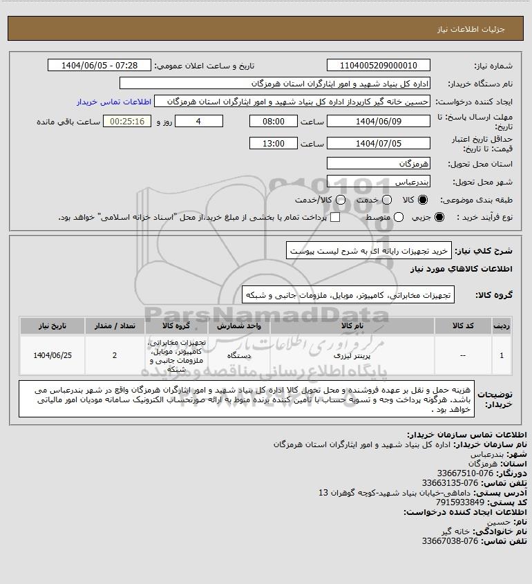 نام دستگاه خریدار:اداره کل بنیاد شهید و امور ایثارگران استان هرمزگان