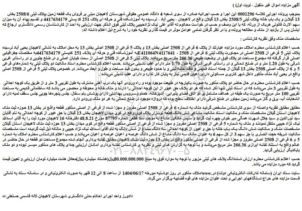 بموجب پرونده اجرایی کلاسه 0001296 این اجرا و حسب اجرائیه صادره از سوی شعبه 4 دادگاه عمومی حقوقی شهرستان لاهیجان مبنی بر فروش یک قطعه زمین بپلاک ثبتی 2508/6 بخش 13 گیلان و یک باب خانه بپلاک ثبتی 2508/5 بخش 13 گیلان واقع در لاهیجان - یحیی آباد - نرسیده به آموزشکده فنی و حرفه ای پلاک 251 کد پستی 4417634179 و تقسیم بهاء آن به میزان سهم الارث قانونی هریک از ورثه، که با این وصف و حسب در خواست محکوم له آقای علی نیک نژادحبیبی پلاک ثبتی فوق الذکر جهت ارزیابی به احد از کارشناسان رسمی دادگستری ارجاع که ایشان پس از بازدید از ملک و مطالعه پرونده و با در نظر گرفتن تمامی عوامل موثر در قیمت گذاری نظریه خود را به شرح ذیل اعلام داشته اند: