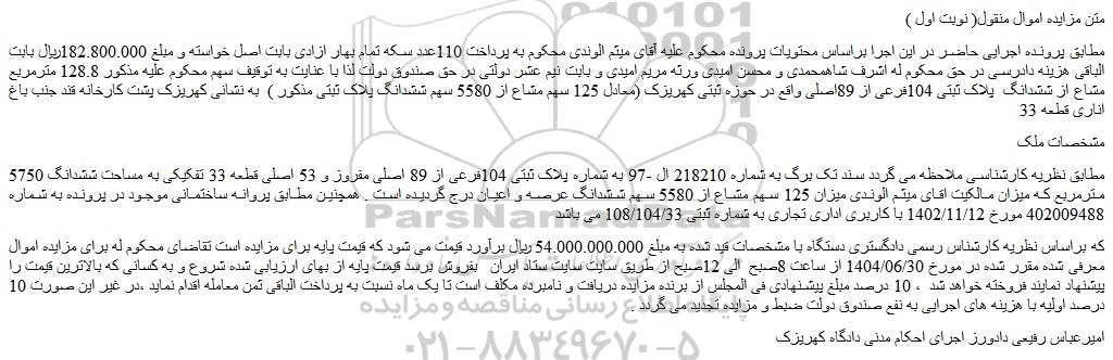 مطابق پرونده اجرایی حاضر در این اجرا براساس محتویات پرونده محکوم علیه آقای میثم الوندی محکوم به پرداخت 110عدد سکه تمام بهار ازادی بابت اصل خواسته و مبلغ 182.800.000ریال بابت الباقی هزینه دادرسی در حق محکوم له اشرف شاهمحمدی و محسن امیدی ورثه مریم امیدی و بابت نیم عشر دولتی در حق صندوق دولت لذا با عنایت به توقیف سهم محکوم علیه مذکور 128.8 مترمربع مشاع از ششدانگ پلاک ثبتی 104فرعی از 89اصلی واقع در حوزه ثبتی کهریزک (معادل 125 سهم مشاع از 5580 سهم ششدانگ پلاک ثبتی مذکور ) به نشانی کهریزک پشت کارخانه قند جنب باغ اناری قطعه 33