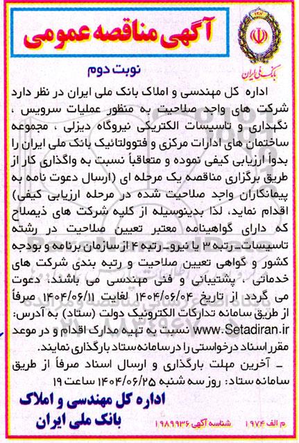 اداره کل مهندسی و املاک بانک ملی ایران در نظر دارد شرکتهای واجد صلاحیت به منظور عملیات سرویس ، نگهداری و تاسیسات الکتریکی نیروگاه دیزلی ، مجموعه ساختمانهای ادارات مرکزی و فتوولتائیک بانک ملی ایران را بدوا ارزیابی کیفی نموده و متعاقباً نسبت به واگذاری کار از طریق برگزاری مناقصه یک مرحله ای ارسال دعوت نامه به پیمانکاران واجد صلاحیت شده در مرحله ارزیابی کیفی اقدام نماید لذا بدینوسیله از کلیه شرکت های ذیصلاحکه دارای گواهینامه معتبر تعیین صلاحیت در رشته تاسیسات رتبه 3 یا نیرو - رتبه 4 از سازمان برنامه و بودجه کشور و گواهی تعیین صلاحیت و رتبه بندی شرکت های خدماتی ، پشتیبانی و فنی مهندسی می باشند دعوت می گردد از تاریخ 1404.06.04 لغایت 1404.06.11 صرفاً از طریق سامانه تدارکات الکترونیک دولت (ستاد) به آدرس سایت ستاد ایران نسبت به تهیه مدارک اقدام و در موعد مقرر اسناد درخواستی را در سامانه ستاد بارگذاری نمایند.