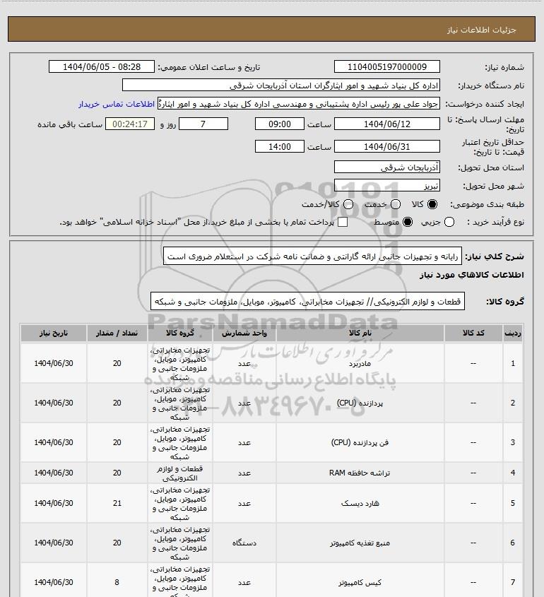 1 -- مادربرد عدد تجهیزات مخابراتی، کامپیوتر، موبایل، ملزومات جانبی و شبکه 20 1404/06/30