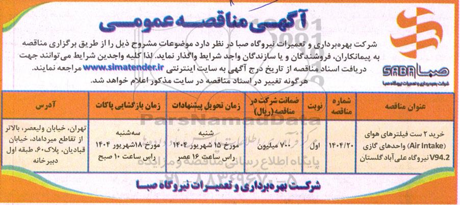 مناقصه خرید 2 ست فیلترهای هوای (Air Intake) واحدهای گازی V94.2  از کلیه افراد متخصص و شرکتها واجد شرایط دعوت به عمل میآید در مناقصه با کد خبرگزاری پارس نماد: 9461648 شرکت نمایند.