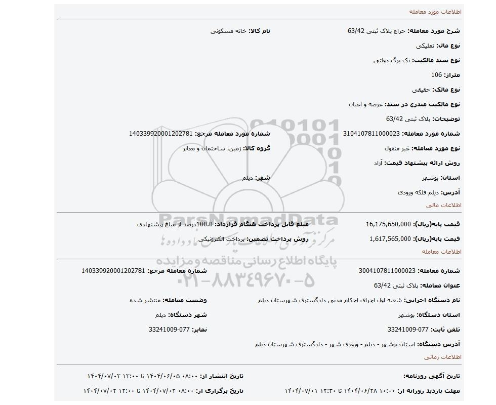 عنوان معامله: پلاک ثبتی 63/42 | ||