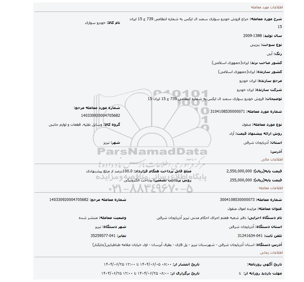 مزایده فروش خودرو سواری سمند ال ایکس به شماره انتظامی 739 ج 15 ایران 15, مزایده، فروش خودرو سواری سمند ال ایکس به شماره انتظامی 739 ج 15 ایران 15