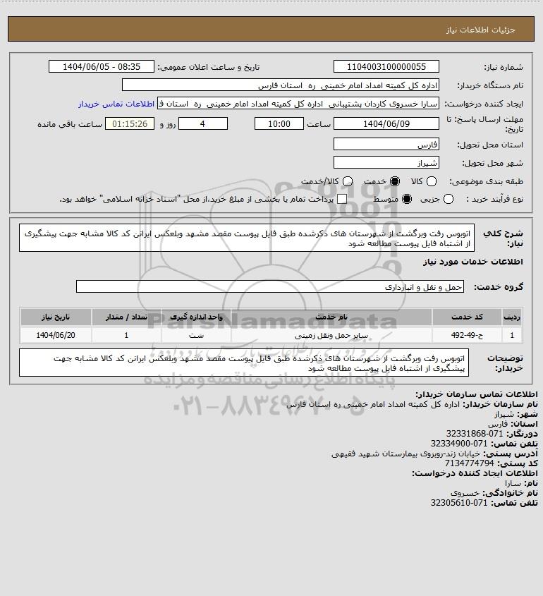 شرح کلی نیاز: اتوبوس رفت وبرگشت از شهرستان های ذکرشده طبق فایل پیوست مقصد مشهد وبلعکس ایرانن کد کالا مشابه جهت پیشگیری از اشتباه فایل پیوست مطالعه شود