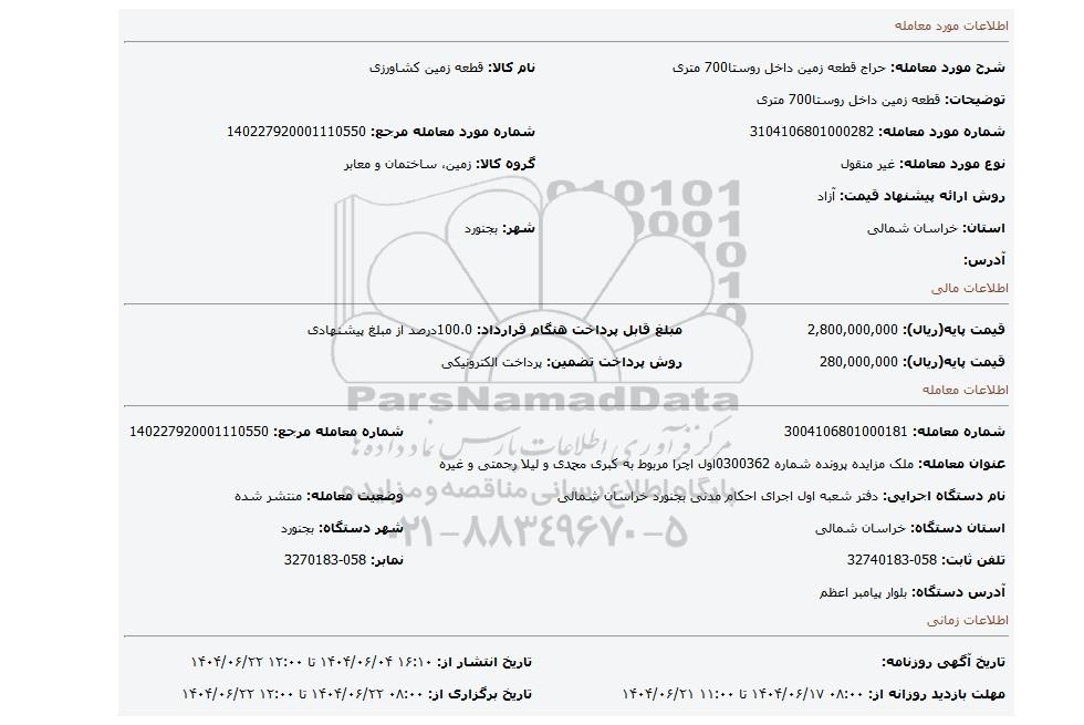 مزایده عمومی مزایده قطعه زمین داخل روستا700 متری برگزار میگردد. از کلیه افراد متخصص و شرکت‌های واجد شرایط دعوت به عمل می‌آید تا در این مزایده با کد خبرگزاری پارس نماد : 9461993 شرکت نمایند تاریخ شروع مزایده : 1404/06/04 مهلت شرکت در مزایده: تا پایان روز 1404/06/22 مکان برگزاری اموال واگذاری استان‌های خراسان شمالی و دسته‌بندی‌های مربوط به این حراجی ماشین آلات و تجهیزات کشاورزی و دام پروری, املاک و زمین میباشد. اطلاعات دقیق‌تر درباره شرایط شرکت در مزایده آنلاین و نحوه ارسال مدارک، الزامات پروژه و دریافت اسناد مزایده و تاریخ بازگشایی پاکت‌ها، در بخش اطلاعات تکمیلی این آگهی درج شده است.