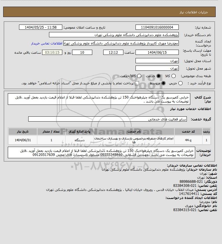 شرح کلی نیاز: خرابی کمپرسور یک دستگاه چیلرهواخنک 150 تن پژوهشکده دندانپزشکی لطفا قبلا از اعلام قیمت بازدید بعمل آورید .فایل توضیحات به پیوست می باشد .